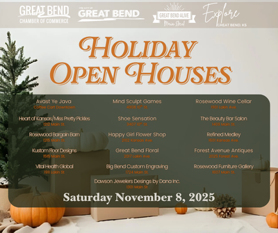 The City of Great Bend, Great Bend Convention and Visitors Bureau, Great Bend Chamber of Commerce and Great Bend Alive invite local retailers and community members to participate in the 2025 “Holiday Open Houses” on Saturday, November 8th, to kick off the shopping season in Great Bend.